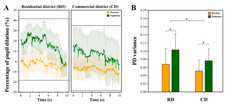 图6显示了所有条件下PD(瞳孔扩张)的持续下降,与商业区相比,住宅区的PD明显更高,表明商业区寻路的认知负荷更高。此外,住宅区和商业区白天的PD均小于夜间。对PD方差进行统计分析(见表7和图8),发现城区的主效应显著(p = 0.004),住宅区的PD方差大于商业区。此外,光环境的主效应显著(p = 0.001),在住宅区和商业区,夜间的PD方差均高于白天。